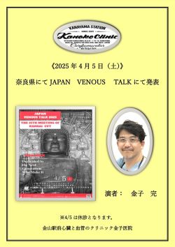 4月5日(土)は奈良県にて学会JAPAN VENOUS TALKで発表となります。休診となりますのでご迷惑をおかけしますがお願いします。